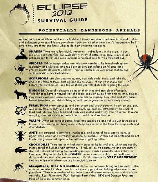 I was on the plane to Singapore reading the inflight magazine when an article caught my eye about a total solar eclipse that was due to take place on the 14th November in Australia. This seemed serendipitous, as I was already heading to Australia -after a pit stop in Singapore (which I will tell you about later)-and had always wanted to see an eclipse. At home they were guaranteed to be disappointing and obscured by a cluster if clouds. A sun-shaped light bulb went off in my head and I thought Eureka-I shall go to the Eclipse and have a ball! I anticipated being in company with geeks, freaks, NASA scientists, eclipse chasers and ravers! A friend put me in touch with her friend who also had the same plan. He emailed me a mysterious hand-drawn map of the Eclipse 2012 festival site and a flag. I was instructed to locate him by finding the flag. How very ‘Alex Garland’s The Beach’. It was basically in the outback, miles from civilization. I knew I had to go to this. I didn’t let the long list of potentially dangerous animals -on the festival website- completely put me off, although I must admit I gulped as I reeled off the list which included Fresh water Crocodiles-with razor sharp teeth, Feral pigs that eat anything-including humans, deadly snakes, spiders and scorpions. I can handle it though-it can’t be much worse than Camden town on a Saturday night!