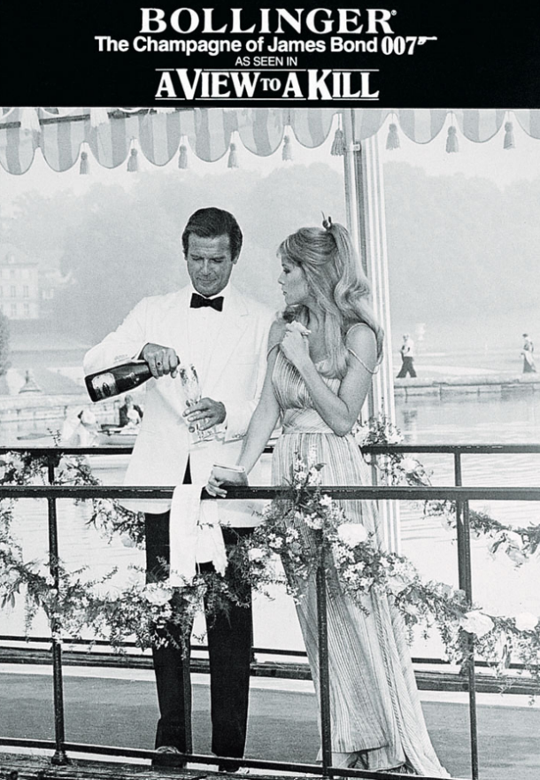 Feature image: Bond (ROGER MOORE) pours a glass of Champagne Bollinger for Stacey Sutton (TANYA ROBERTS) at Zorin’s French estate. © 2025 Metro-Goldwyn-Mayer Studios Inc. All Rights Reserved.