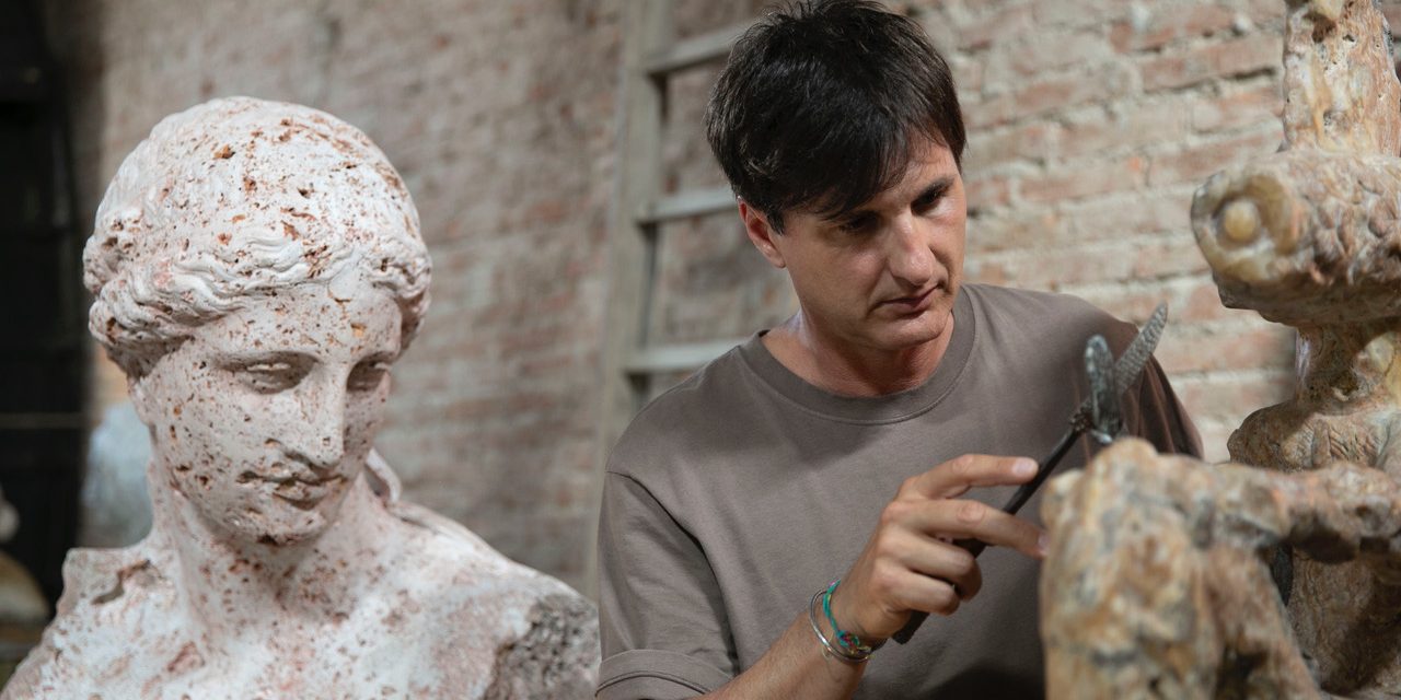 Known for merging classical forms with fractured materials, Pelletti brings a body of work that feels both rooted in antiquity and entirely contemporary. His sculptures – often masked, broken, or eroded – reinterpret Greco-Roman gods and human anatomy through onyx, marble and fossil-laced stone, honouring not perfection but its opposite.