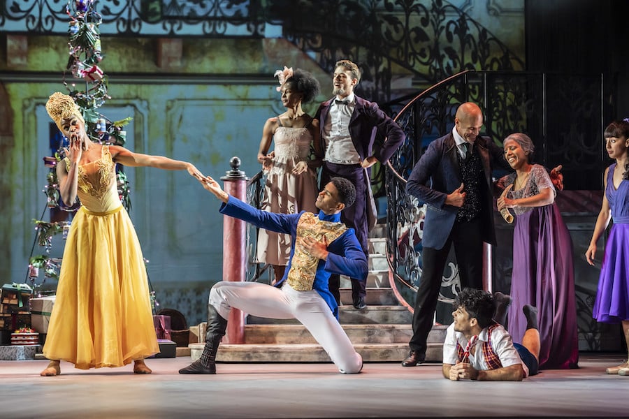 The production is visually inventive. Nina Dunn’s projections sweep the audience from Havana’s sunlit streets to rural landscapes and the glittering Kingdom of Sweets. Andrew Exeter’s lighting shifts the mood from tropical warmth to snowy fantasy without a hint of artifice. Angelo Alberto’s costumes are playful and precise — from the maypole clogs to the Sugar Plum Fairy’s glittering gown — while snow, confetti, and magical transformations punctuate the action, producing real moments of delight.