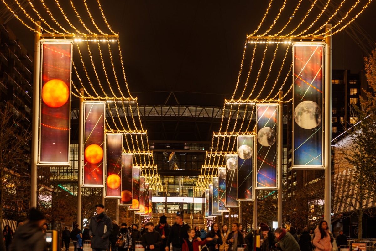This Christmas, Olympic Way glows courtesy of Douglas Green and Louisa Smurthwaite’s returning installation, ‘A Guiding Light’, filling Wembley Park with 36 seven-metre-tall banners charting moonrise and sunset. Overhead luminaries sway gently above, adding rhythm and movement to the boulevard.